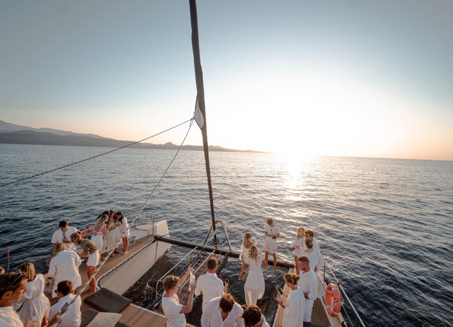Nos sorties en soirée sont des apéros festifs, animées par un dj ou par un groupe en live, et vous permet d'admirer le superbe coucher de soleil tout en faisant la fête dans les eaux paisibles du golfe de Saint-Florent... un concept unique en Corse qui a fait la réputation du catamaran Bella Vita !!!